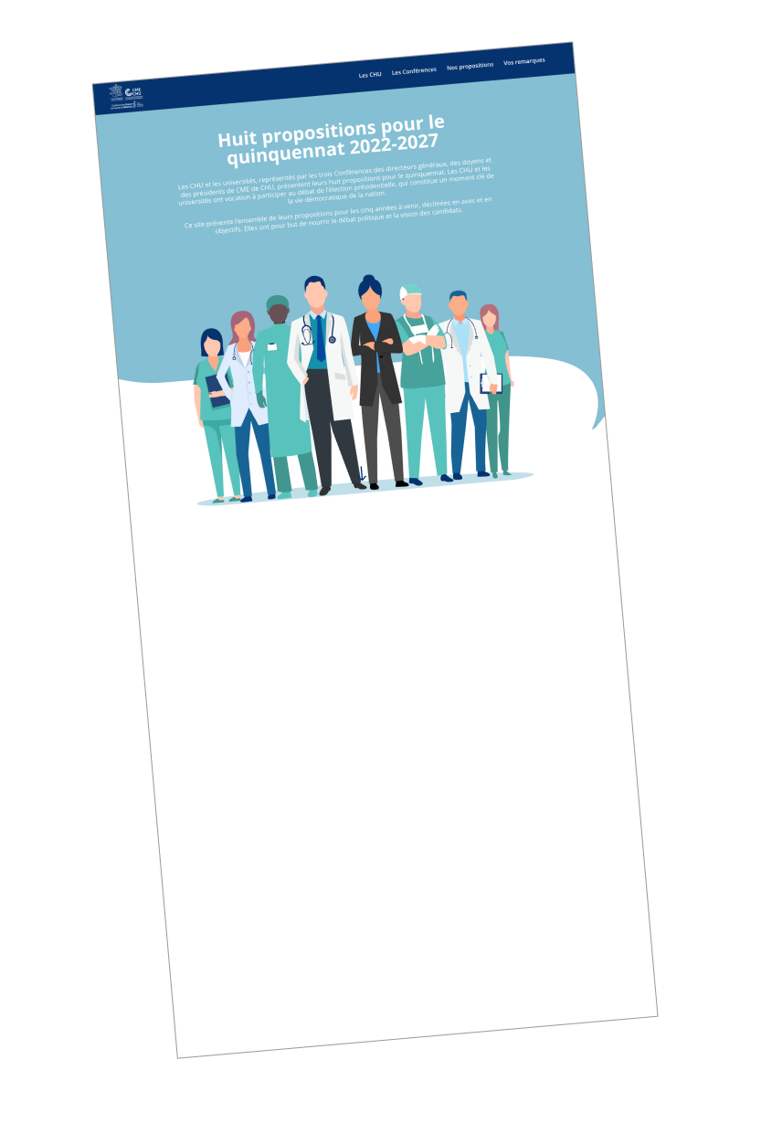 Les CHU et les universités, représentés par les trois Conférences des directeurs généraux, des doyens et des présidents de CME de CHU, présentent leurs huit propositions pour le quinquennat. Les CHU et les universités ont vocation à participer au débat de l’élection présidentielle, qui constitue un moment clé de la vie démocratique de la nation.